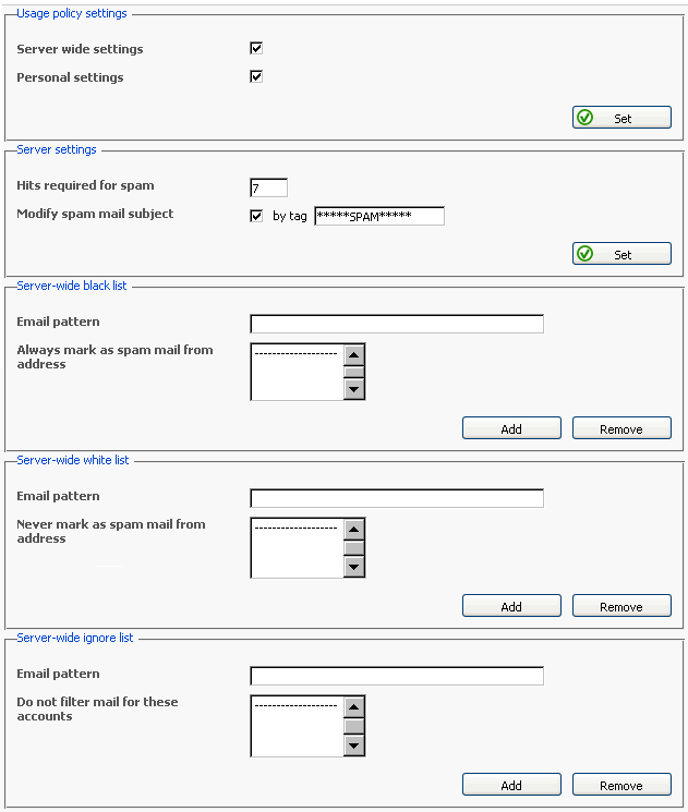 これでサーバ単位のスパムメールフィルタ設定は終了です。すべての受信メールはこれらの設定に従って処理され、ユーザはすでにフィルタによって処理されたメールを受け取ります。さらに、フィルタの処理により(パーソナル設定のチェックボックスがチェックされている場合)、ユーザは自分のフィルタリングルールを設定し、自分のメールアカウントでそれに従いメールを処理できます。